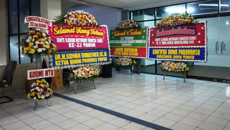 Terlihat karangan bunga yang dikirim oleh Gubernur Provinsi Jawa Timur Khofifah Indar Parawansa yang mengucapkan selamat dan sukses KORMI ke-22 tahun, menuju Indonesia Bugar tahun 2045.